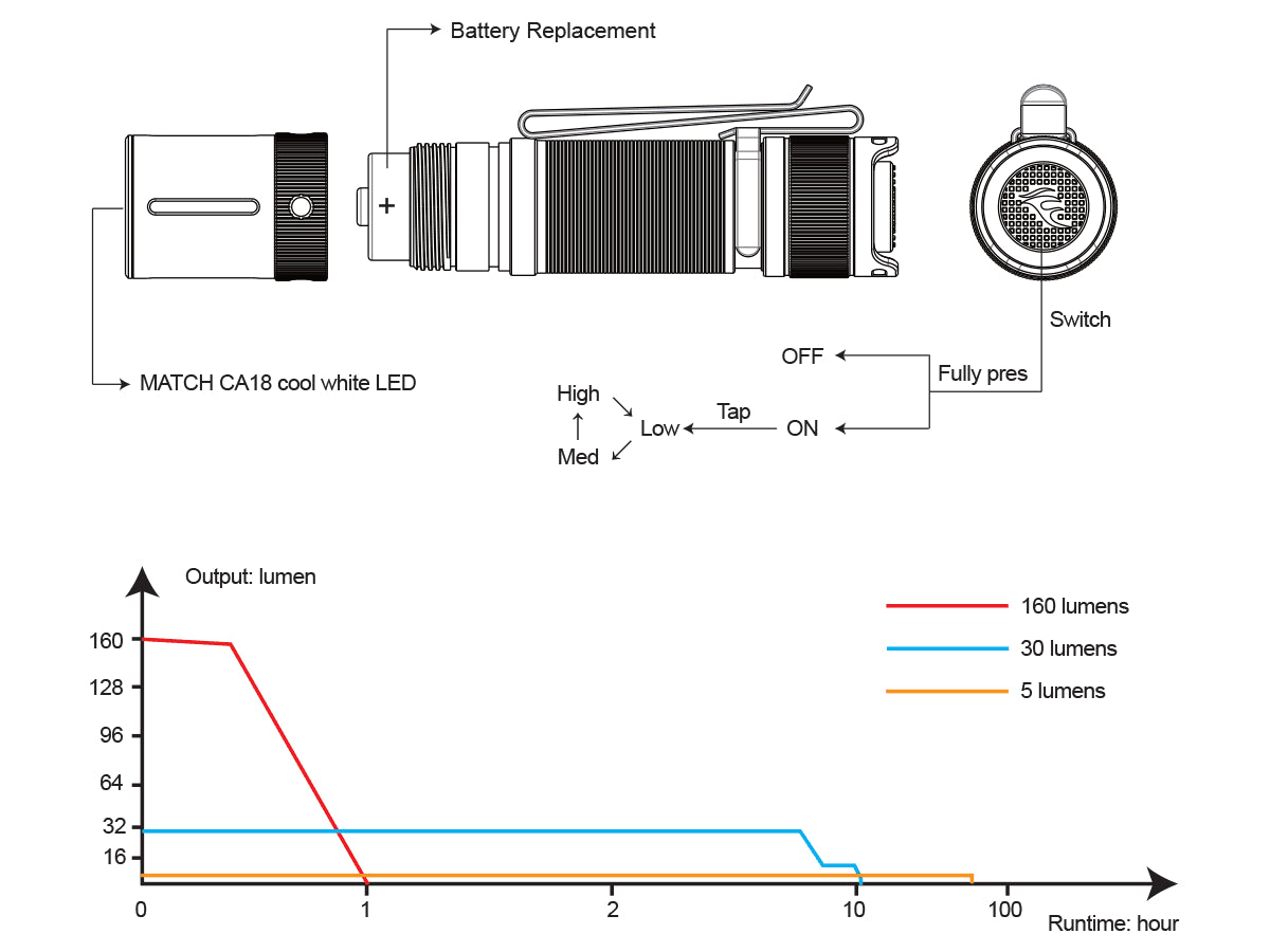 Access three brightness levels with a tap of the tail switch. At only 3” long, this flashlight is a great everyday carry size, and with its two-position body clip, you can carry it as you want—even clip it to your hat and use it as a headlamp.